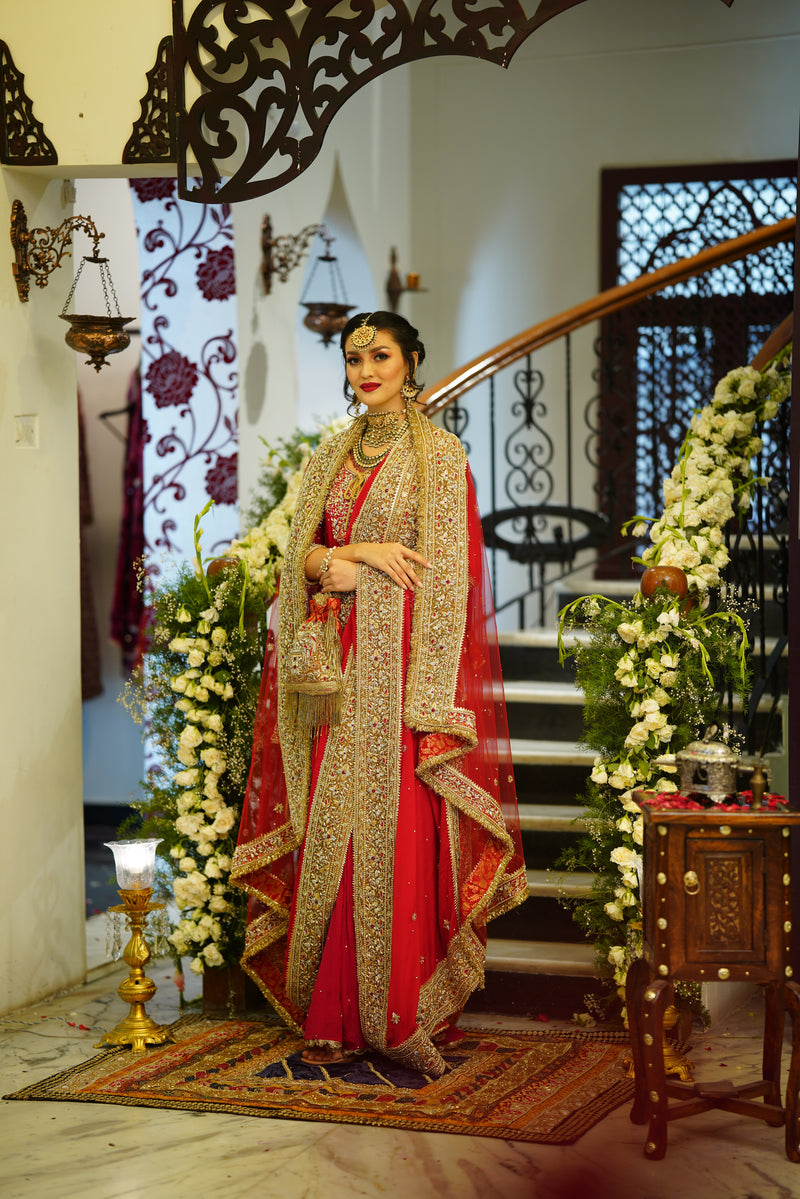 Product Description: Sheenaz-e-Aroosa features an imperial red embroidered straight cut kurti with a chiffon gharara and a khadadupatta saree draped all over in one of our many drapes. It is paired up with an embroidered net ghunghat with bootas to give a royal bridal look. The borders of the saree as well as the ghunghat are enhanced with kiran lace overall. Give a final touch with heavy bridal jewelry and a pothli bag.