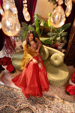 Set in a rich crimson hue, the bodice is a work of art—lavishly adorned with shimmering zardozi, pearls, sequins, and cutdana. Traditional floral bursts bloom across the chest and sleeves, while the neckline is sculpted to flatter with quiet confidence. The silhouette flows into a crushed kalidaar skirt that moves like memory—fluid, soft, and full of grace.